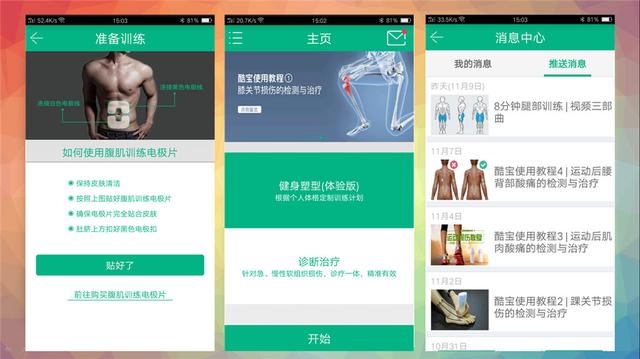 APP主要为人群设定了两种功能:一个是健身塑形,一个是诊断治疗。通过酷宝进行塑身造型健身,那就得另外购买腹肌训练电极片,可以在APP上进行页面跳转。