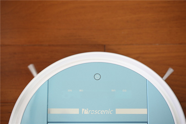 正面板采用了iml工艺ABS+PC耐磨材质,整体看上去非常小清新,非常漂亮,面板上一共是有5个按键,分别是启动自动清扫、自动回充、多种模式清扫、预约时间、延边清扫 这5个按键。功能挺丰富的。