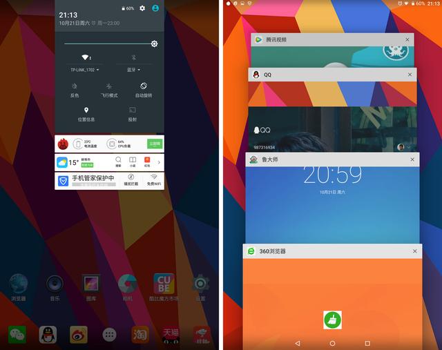 系统信息提示位于顶部,一次下滑可以轻松唤出信息提示,二次下滑可以继续唤出WIFI、蓝牙、反色、飞行模式、自动旋转、位置信息、投射等常用设置。酷比魔方Freer X9最的特色在于不仅有实体HOME键还拥有类似于华为手机的虚拟按键,通过底部上滑可以轻松唤出,三个虚拟按键依次为返回、主页、多任务管理。