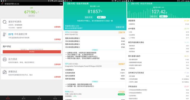 跑分是最简单粗暴展现性能的方式,为了不埋没酷比魔方Freer X9如此良心的配置,分别用安兔兔和鲁大师两款主流跑分软件进行了综合性能测试。安兔兔实测67190分,鲁大师综合评分为81857分,体验评分为127.42分,从整个跑分表现而言,性能处在中上等水平,与整体配置遥呼相应。