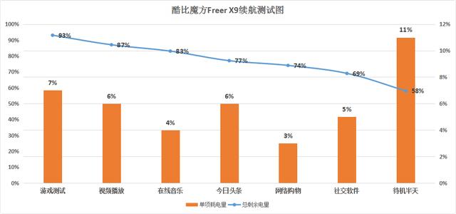 在续航方面,酷比魔方Freer X9的表现可谓是中规中矩。通过游戏、视频播放等6个方面各半个小时的实测数据显示,其中游戏半个小时耗电量最大,网络购物半个小时耗电量最小,三个小时实测之后剩余电量为69%。由于系统不支持应用回收,所以在待机时如不关闭应用电量损耗也较快。就日常使用而言,维持一天毫无悬念。