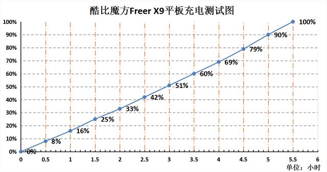 酷比魔方Freer X9内置有5500毫安的锂电池,支持5V-2A的快充,但是实际体验还是有点失望,从0充至100%全程需要接近5.5个小时,我手里的5000毫安手机充满电大概只需要两个半小时左右,由此可见酷比魔方Freer X9的充电速度卓识有些滥竽充数的成分。